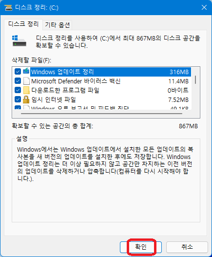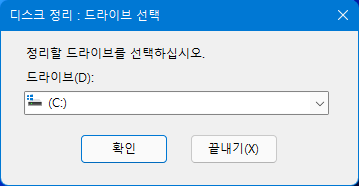 정리할 드라이브(물론 C드라이브)를 선택하고 "확인"을 클릭하자.