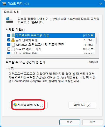 잠깐 기다리면 위와 같은 창이 뜨는데, 그냥 확인을 클릭하면 안되고 "시스템 파일 정리"를 클릭하자.