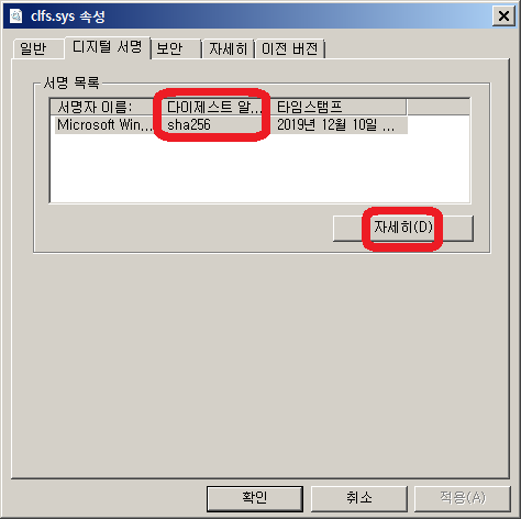 SHA-2가 지원되면 "디지털 서명" 탭의 "다이제스트 알림" 부분에 sha256이라 뜨고,