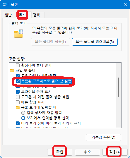 "보기"를 클릭하고 "고급 설정" 옵션 부분에서 "독립된 프로세스로 폴더 창 실행"을 체크 선택하고 "적용"-"확인"을 클릭하자.