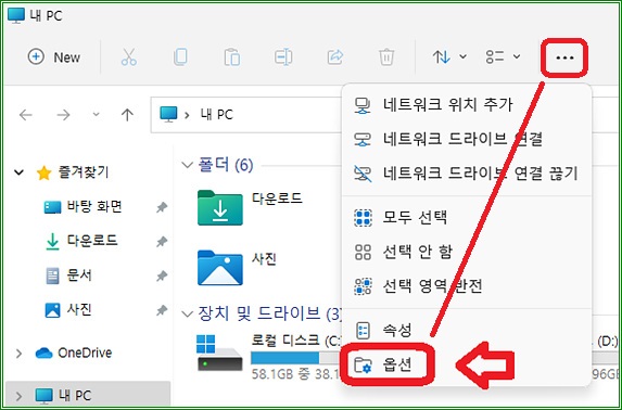 윈도우11에서 파일 탐색기를 실행하고 메뉴 부분의 점점점을 클릭한 다음 "옵션"을 클릭하자.
