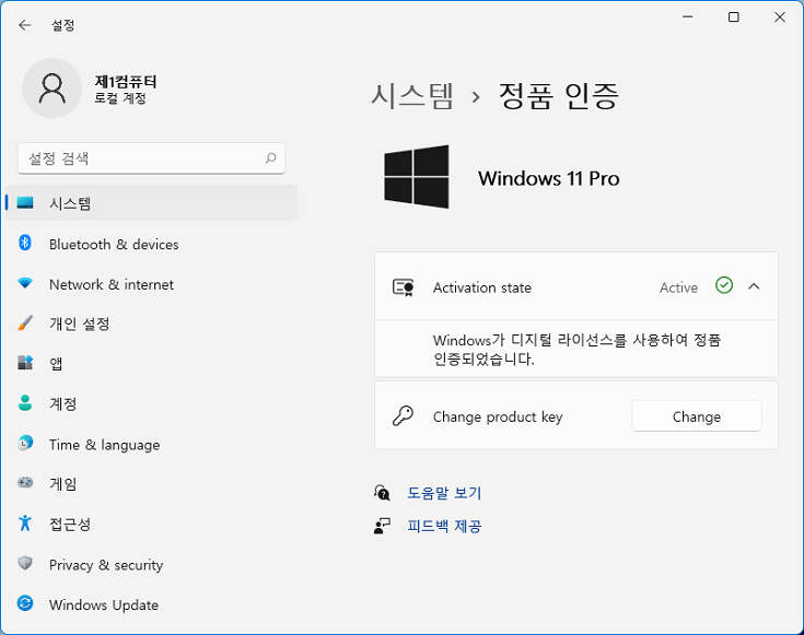 윈도우11 Pro를 설치하니 위와 같이 정품인증되었다.