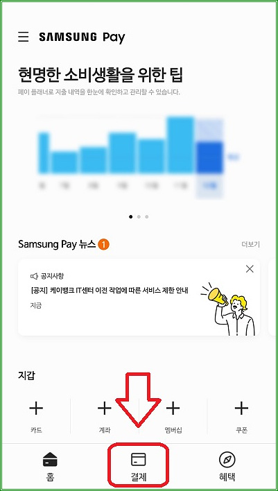 와이파이 연결 상태에서 삼성페이 앱을 실행하고 "결제"를 터치하면..