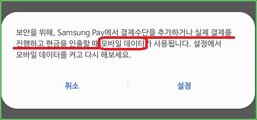 결제수단을 추가하거나 실제 결제를 진행하고 현금을 인출할 때에는 모바일 데이터를 켜야 한다.