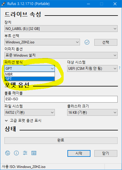 "파티션 방식" 부분을 주의해야 하는데, 메인보드가 바이오스 방식이라면 MBR을, UEFI 방식이라면 GPT로 선택해야 한다. 관련해서 자세한 내용은 [바로가기] 참고하자.