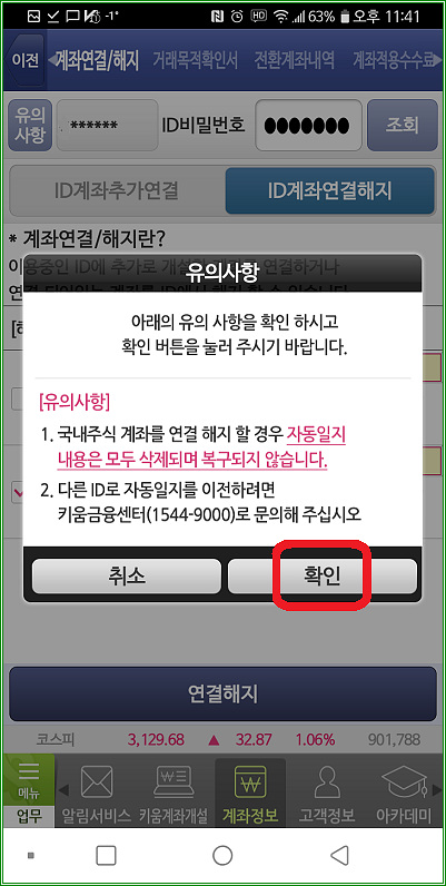 "계좌연결/해지" 탭을 터치하고, "ID계좌연결해지"를 터치하고 해지하고자 하는 계좌번호를 선택한 다음 "연결해지"를 터치하자.