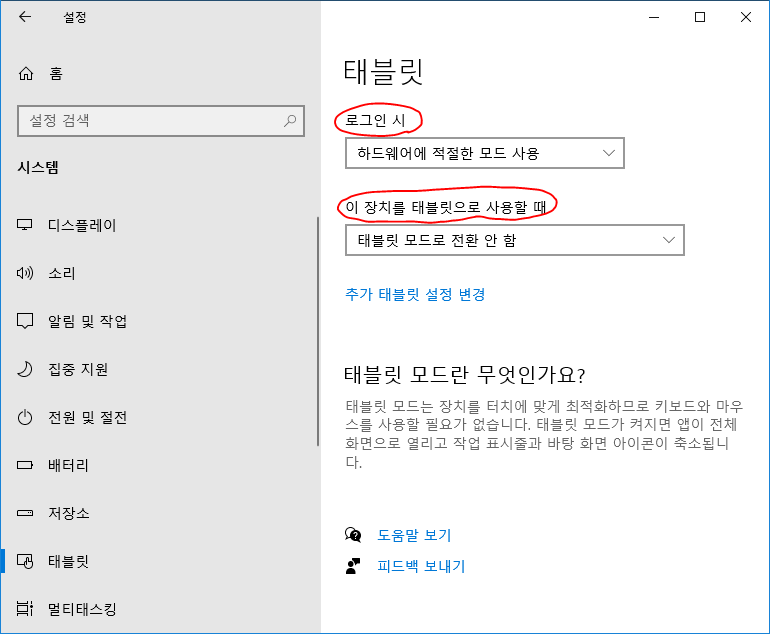 "로그인 시" 항목과 "이 장치를 태블릿으로 사용할 때" 옵션을 수정하면 된다.