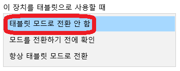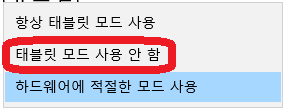 (이전버전에서는 "데스크톱 모드"였는데, 최신버전은 "태블릿 모드 사용 안 함"이다)