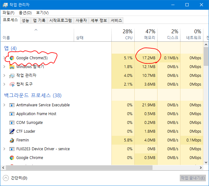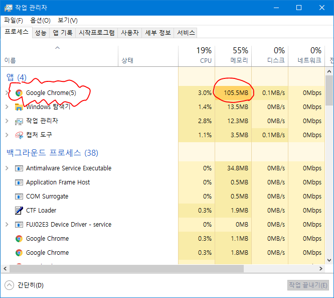 크롬을 실행하고 탭을 세 개 띄운 상태에서 메모리 사용량.