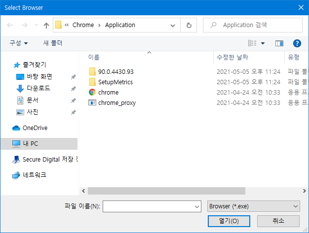 프로그램을 실행하면 위와 같이 뜨는데, Browse를 클릭해서 크롬 혹은 Chromium 계열의 웹브라우저 실행파일을 설정하면 된다.