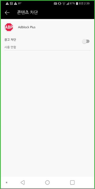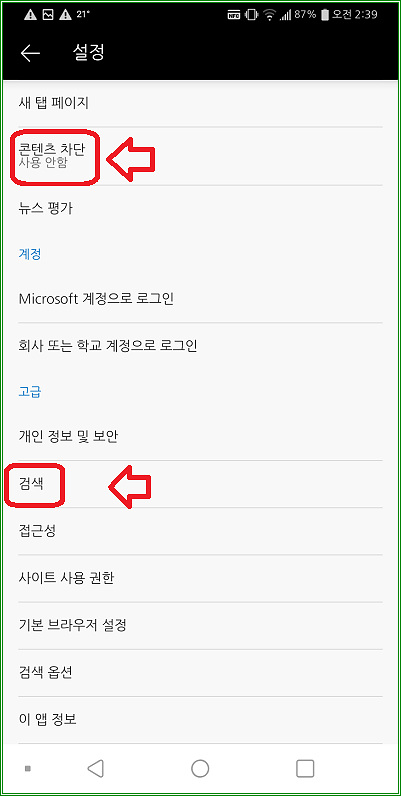 광고를 차단하려면 "콘텐츠 차단"으로, 주소 표시줄의 검색엔진을 바꾸려면 "검색"을 터치하면 된다.