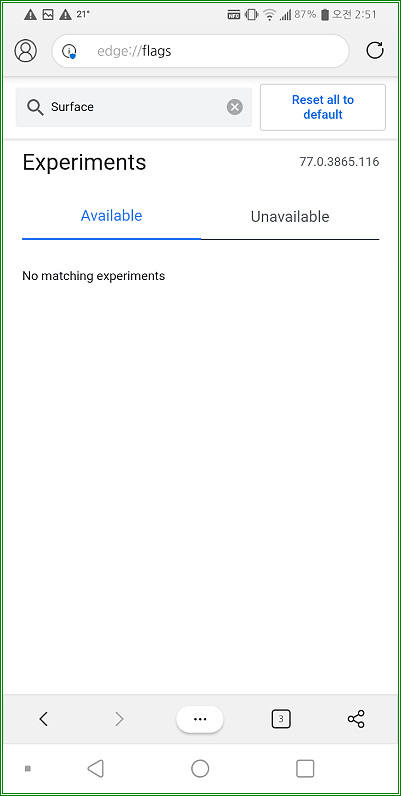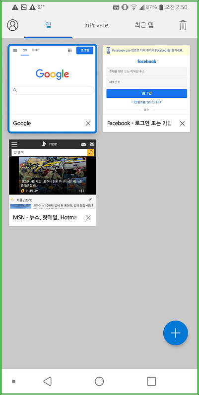 모바일 엣지 역시 Chromium 기반이라서 슬라이딩 방식의 탭 전환은 지원하지 않는다.