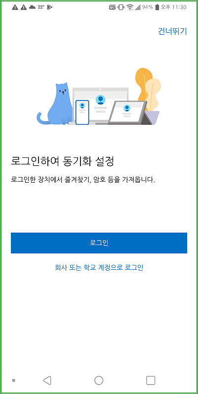 안드로이드 엣지 처음 실행시 PC용 엣지와 마찬가지로 MS 계정 로그인을 요구한다.