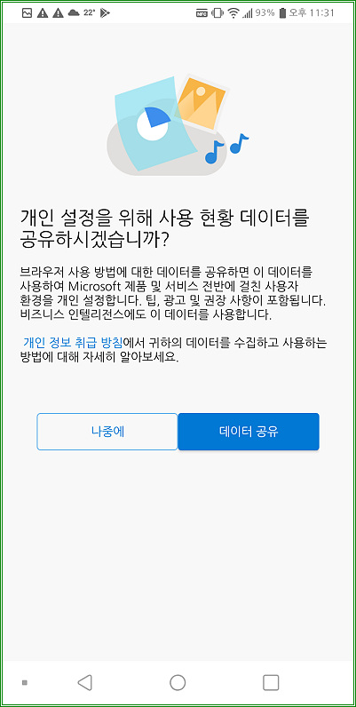 방문한 웹 사이트에 대한 데이터를 공유할 수 있는데, 그냥 "나중에"를 눌렀다.