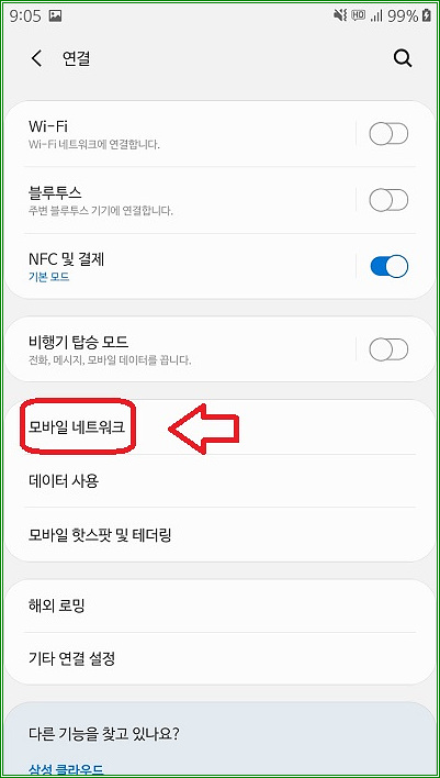 일단 설정-"네트워크"-"모바일 네트워크"를 터치하자.