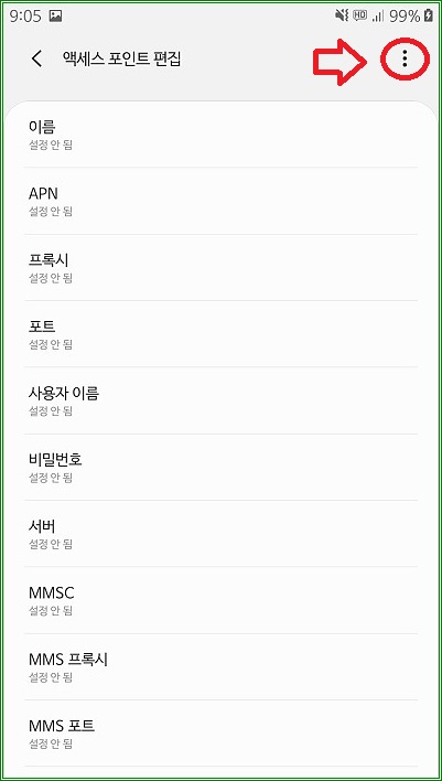 APN 값을 입력한 다음 우측 상단의 점점점을 터치하고 "저장"을 터치하자.