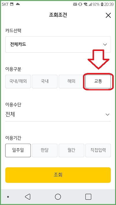 조회하고자 하는 기간을 지정한 다음 "교통"을 선택하고 "조회"를 터치하면 된다.