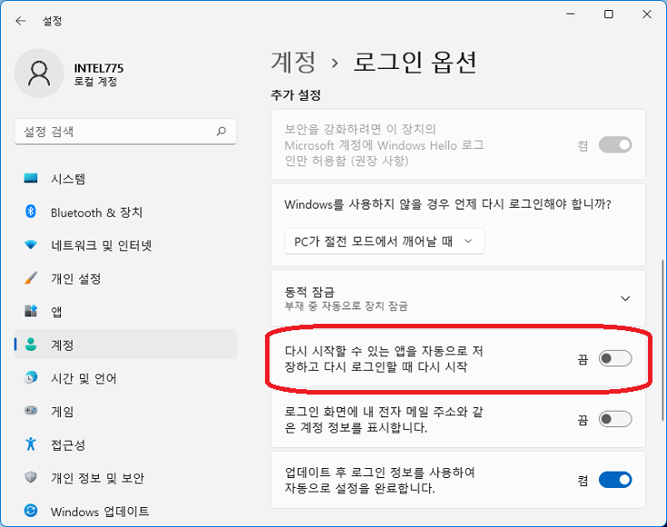 보시다시피 "다시 시작할 수 있는 앱을 자동으로 저장하고 다시 로그인할 때 다시 시작" 부분이 "끔"으로 기본 설정되어 있다.