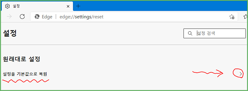 혹은 주소 입력하는 부분에 edge://settings/reset 을 입력해서 들어가도 된다.
