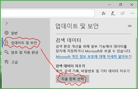 "업데이트 및 보안"을 클릭하고 "지울 항목 선택"을 클릭하자.