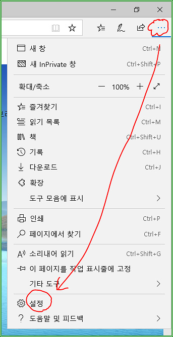 Chromium 엣지와 마찬가지로 우측 상단의 점점점 버튼을 클릭하고 "설정"을 클릭하자.