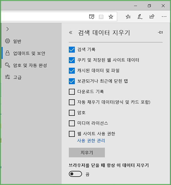 : 윈도우10 구버전의 엣지 브라우저는 아래와 같이 '준' 초기화 가능하다.참고로 윈도우10 최신버전에서도 Chromium 엣지 뿐만 아니라 EdgeHTML 구 엣지도 사용할 수 있다.