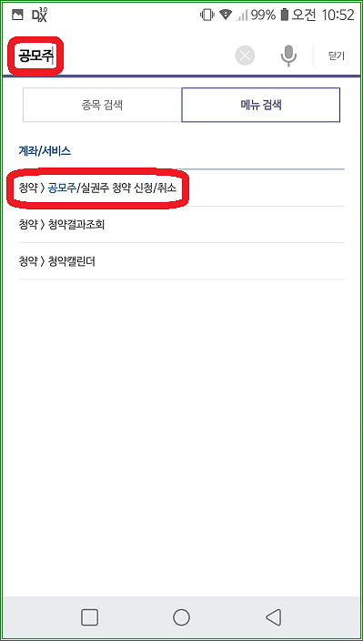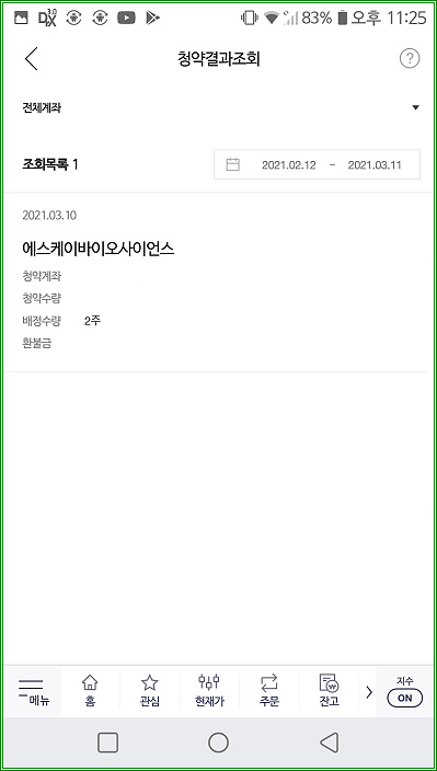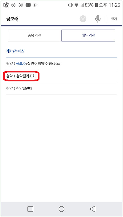 마찬가지로 "공모주"를 검색하면 관련 메뉴가 주르륵 뜨는데, "청약결과조회"를 터치하자.