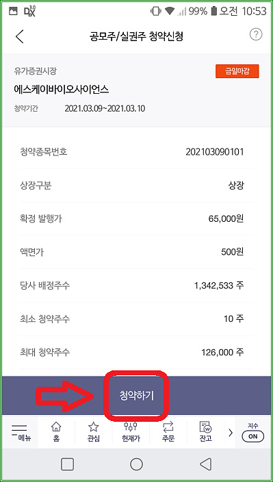 청약주수를 선택하고 "청약하기"를 터치하자.