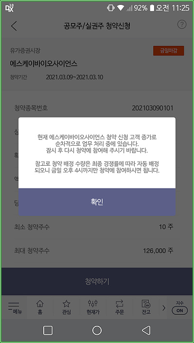 인기가 많은 공모주는 서버 과부하로 인하여 시간이 한참 소요될 수 있다.