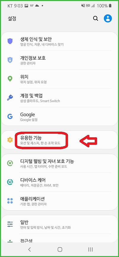"유용한 기능(모션 및 제스처, 한 손 조작 모드)"을 터치하자.