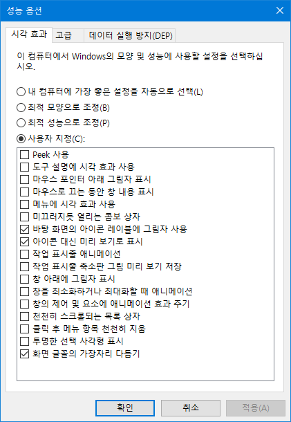 윈도우는 "성능 옵션"에 들어가서 위와 같이 설정해 주면 애니메이션 효과가 줄어든다[바로가기].