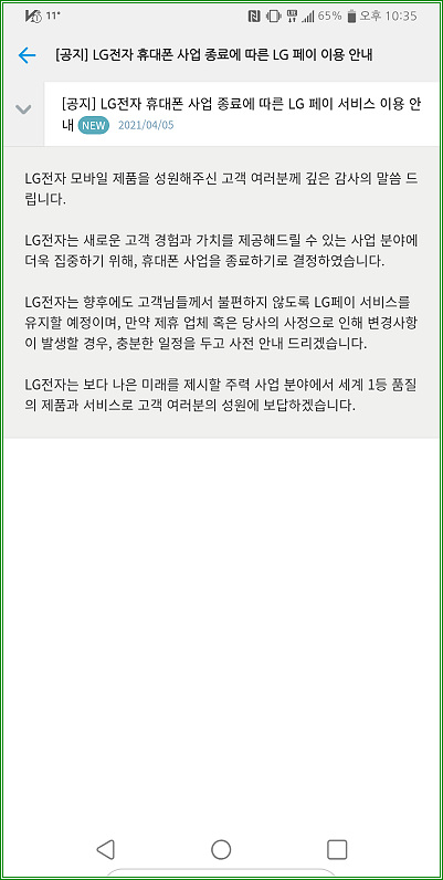 2021년 5월까지 휴대폰을 생산할 계획이니까 2024년 5월까지는 종전처럼 LG페이를 사용할 수 있을 것이다.