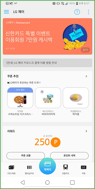 LG페이에 두드림플러스체크카드를 결제해 두고 사용하고 있다.