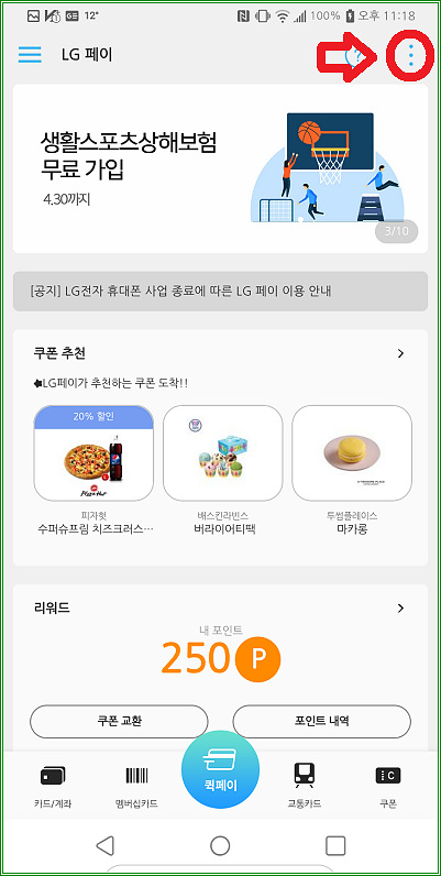 일단 LG페이 앱을 실행하고 우측 상단에 있는 점점점 버튼을 터치하자.