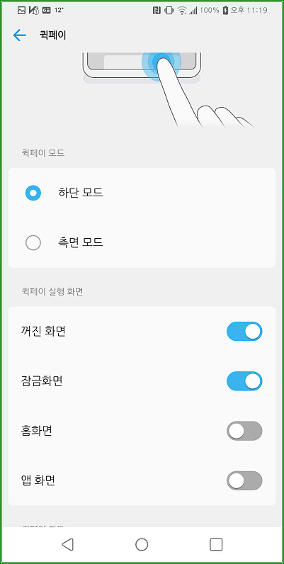 "퀵페이(꺼진 화면, 잠금화면, 홈화면, 앱 화면)"를 터치하자.