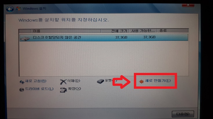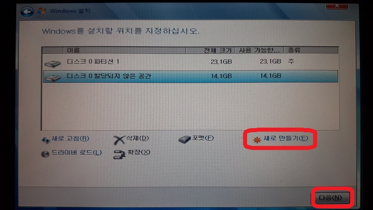 7-3. D드라이브 생성 (이미 하드디스크가 파티션 분할되어 있다면 7-4로 건너뛰자)