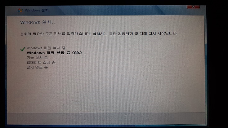 9. 파일 복사가 완료되면 컴퓨터가 재부팅된다. 앞으로 컴퓨터가 한 번 더 재부팅된다.