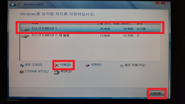 보시다시피 C드라이브, D드라이브 등 드라이브가 문자가 뜨지 않기 때문에, 주의해서 삭제해야 한다. 삭제 후 7-4로 넘어가자.