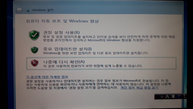 윈도우7 설치 완료 후 따로 업데이트를 해줘야 하니까 "나중에 다시 확인"을 선택하자.