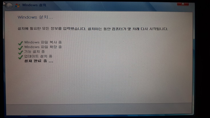 22. 컴퓨터가 재부팅된다. 이제 윈도우7 설치 자체는 거의 다 마무리되어 간다.