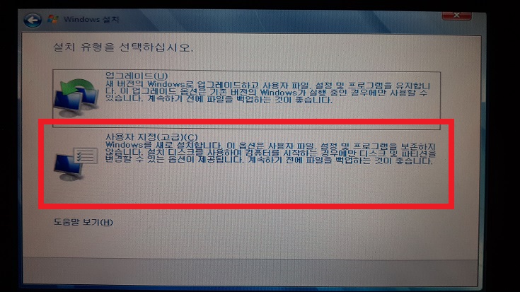 6. 설치 유형 선택 옵션이 뜬다. "사용자 지정"을 터치하자.