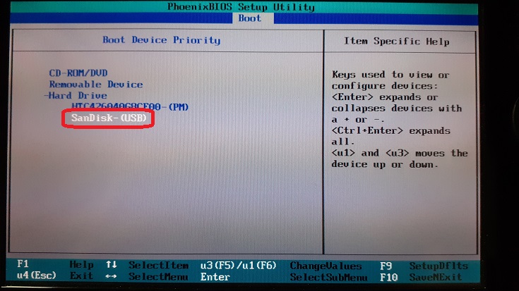 부트메뉴로 들어가지 못하면 CMOS 상에서 USB 메모리인 장치를 맨 위로 올리면 된다.