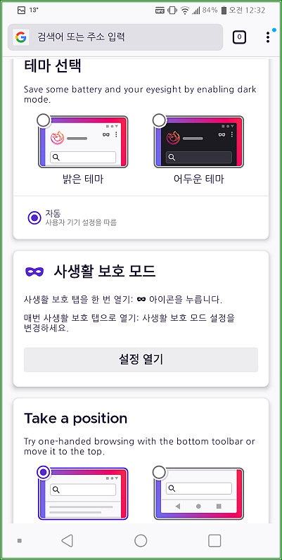 테마 설정(다크 모드)도 가능하고 주소 표시줄의 위치를 상단 혹은 하단으로 설정할 수 있다.