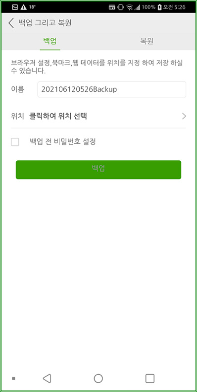 백업 파일은 폰의 내장메모리 혹은 외장메모리에 저장할 수 있다.