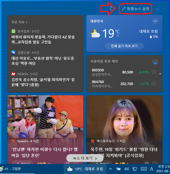 표시되는 뉴스 콘텐츠를 변경하려면 우측 상단의 "맞춤뉴스 설정"을 클릭하자.
