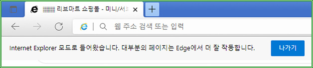 아래와 같이 엣지 브라우저에서 "IE모드"로 웹페이지를 열면 된다.