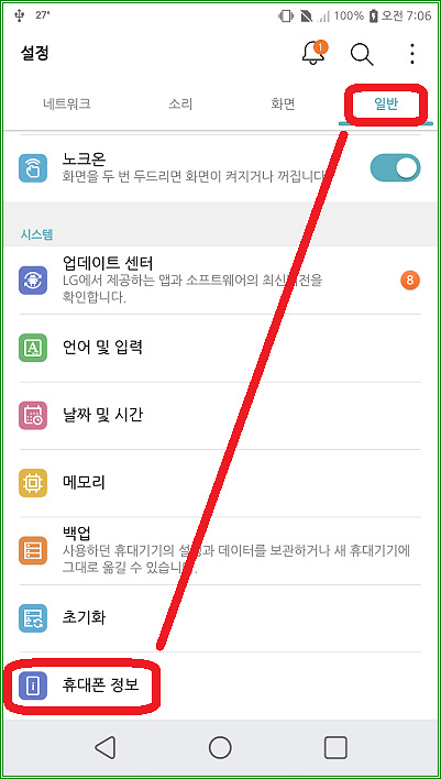 설정 메뉴로 들어가서 "일반"-"휴대폰 정보"를 터치하자.