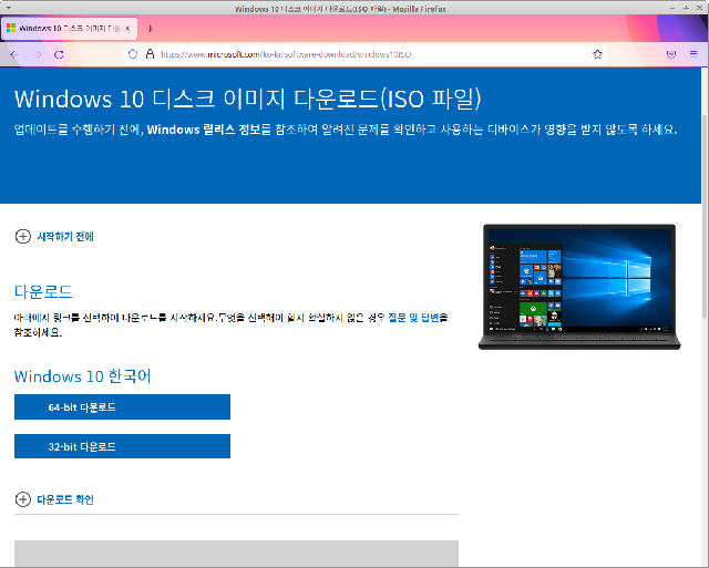 우분투 등 리눅스 환경에서는 MS 윈도우10 다운로드 페이지에서 바로 ISO 파일로 다운된다.