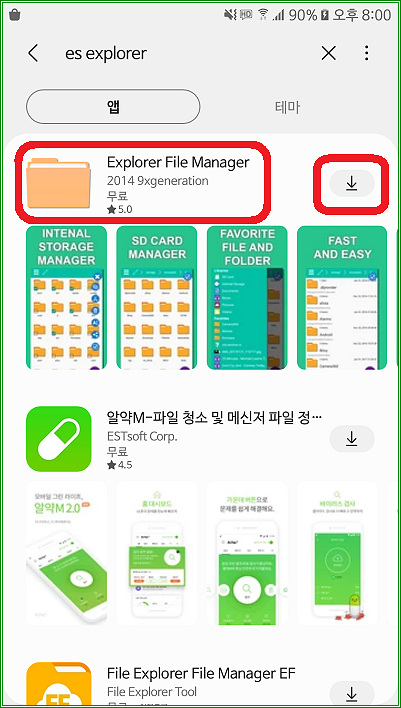 5. 이어서 갤럭시 앱스(갤럭시 스토어)를 실행해서 es explorer를 검색한 다음 "Explorer File Manager"를 다운받자.