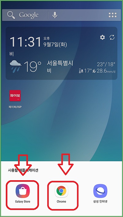 "사용할 애플리케이션"에 Galaxy Apps(Galaxy Store)와 Chrome이 보인다.